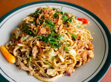 Bakmi Jawa is a traditional Javanese-style noodle dish from Yogyakarta. It can be served fried (mie goreng) or as a soup (mie godhog). The noodles are cooked with chicken, eggs, vegetables, and spices over a charcoal stove, giving them a distinctive smoky flavor. This slow, hand-cooked process makes Bakmi Jawa rich, fragrant, and deeply comforting — a favorite evening street food across Yogyakarta.