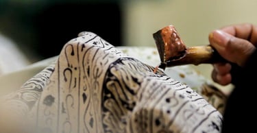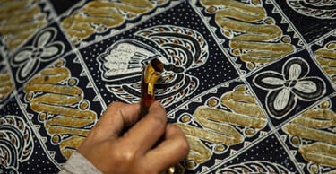 Batik is a traditional Indonesian textile art created by applying wax patterns to fabric and then dyeing it. The wax resists the dye, leaving intricate, multicolored designs once the wax is removed. This process can be repeated many times to produce highly detailed and vibrant patterns.