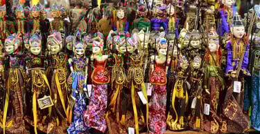 Popular handicrafts include miniature wayang puppets (tiny versions of traditional Javanese shadow puppets), wood carvings, batik-patterned accessories, leather crafts, blangkon (Javanese headgear), traditional musical instruments, and decorative items inspired by Javanese mythology.
